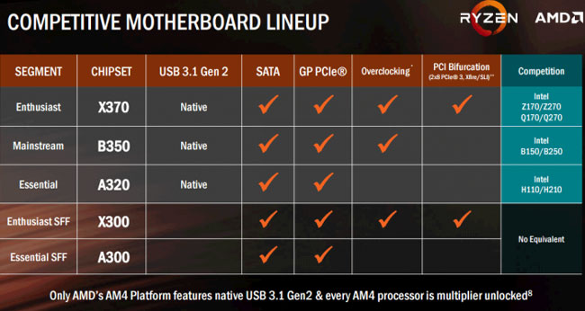 افزون بر چهار درگاه USB 3.0 ذاتی (native) که توسط کلیه پردازنده های Ryzen قابل ارائه است، هر یک از چیپ ست دو درگاه دیگر اضافه می کند. همچنین از پیکربندی های RAID 0/1/10 برای وسایل ذخیره سازی پشتیبانی می شود. دو چیپ ست رده مصرف کننده X370 و B350 از اورکلاکینگ پشتیبانی می کنند. با این حال به وضوح سازندگان مادربرد می توانند از طریق تبعیه تراشه های کنترلر اضافی (ثانویه) ترکیب و تعداد درگاه ها و قابلیت های ارتباطی را تغییر دهند.