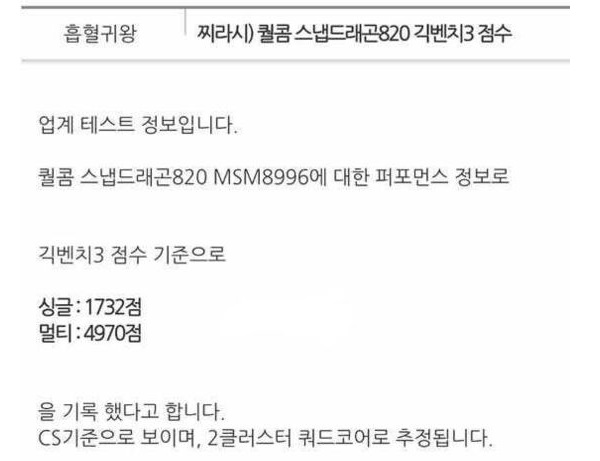 Snapdragon 820: امتیاز در تست تک هسته ای 1732، امتیاز در تست چند هسته ای 4970