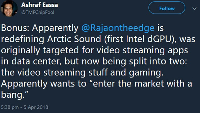 تحلیل گیر آشنای کمپانی The Motley Fool، «اشرف عیسی» (Ashraf Eassa)، در تازهترین تویت خود از تأثیر گذاری سریع استخدام راجا کودوری بر برنامههای اینتل گفته است و ادعا میکند این کمپانی سرگرم تلاش برای تبدیل کردن یک پردازنده گرافیکی با کُد Arctic Sound به یک محصول گیمینگ است. می دانیم پردازنده گرافیکی مجزا Arctic Sound در اصل برای مصارفی چون استریم ویدئو و دیتاسنترها طراحی شده است اما حالا ادعا میشود اینتل به دنبال تغییر کاربری آن به گیمینگ است.