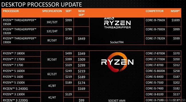 پردازندههای Ryzen و رایزن Threadripper نسبت به اینتل ارزان بودند، حالا ارزانتر هم شدهاند! هفته گذشته AMD رسماً قیمت پردازندههای خود را کاهش داد و حالا انتخابهای بیمنازع نزد کسانی هستند که به خوبی میدانند چگونه پول خود را خرج کنند. شما میتوانید با صرف هزینه بسیار کمتر، پردازندههایی با تعداد بیشتری هسته پردازشی تهیه کنید. مطمئناً این چیزی نیست که کاربران حرفهای، تولیدکنندگان محتوا و گیمرها بتوانند آن را نادیده بگیرند. برای نمونه شما میتوانید با صرف فقط 299 دلار یک پردازنده 8 هستهای Ryzen 7 1700 با توانایی اجرا 16 رشته همزمان تهیه کنید، چیزی که محال است بتوانید با صرف کمتر از 599 دلار از برند اینتل تهیه کنید. تقریباً تمامی پردازندههای Ryzen و Ryzen Threadriper نسبت به نمونههای اینتل بسیار ارزانتر هستند و همین ارزش خرید بینظیری به آنها میبخشد.