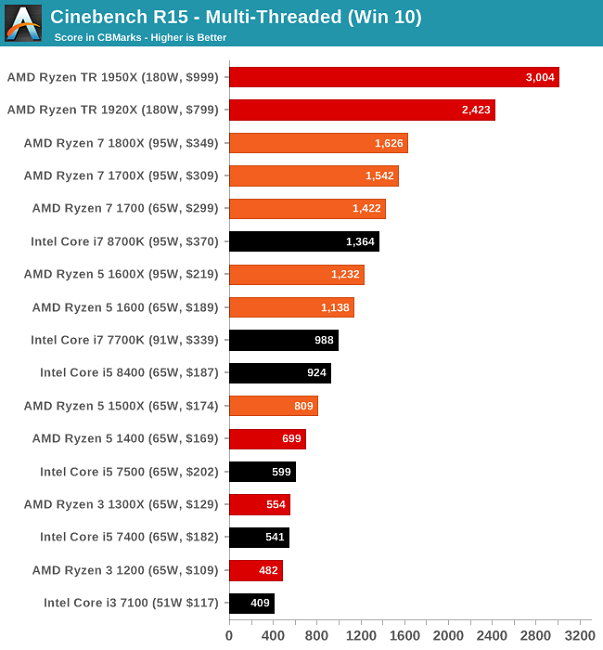 نمودار فوق که توسط مجله آنلاین مشهور و معتبر AnandTech تهیهشده، برتری مشهود پردازندههایAMD در پردازشهای با توانایی استفاده از بیش از یک هسته پردازشی را نشان میدهد. نه تنها در اغلب سناریوها پردازندههای Ryzen و Ryzen Threadripper دست بالا را دارند، بلکه بسیار هم مقرونبهصرفه تر هستند.