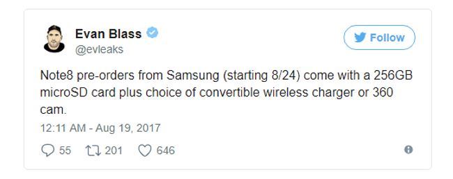 این موضوعی است که توسط لیکر مطرح، ایوان بلس اعلام شده است. بر اساس این طرح، سامسونگ قرار است تجهیزات جانبی رایگان و البته چشمگیری را در اختیار کاربرانی قراردهد که در طرح پیش فروش گلکسی نوت ۸ حضور پیدا کردهاند. به گفته ایوان بلس، پیش فروش گلکسی نوت ۸ از تاریخ ۲۴ آگوست برابر با دوم شهریورماه آغاز خواهد شد و کسانی که در این طرح شرکت کنند تجهیزات جانبی رایگان را دریافت خواهند کرد. سامسونگ کارت حافظه جانبی ۲۵۶ گیگابایت را به همراه گزینه شارژر بیسیم کانورتیبل یا دوربین ۳۶۰ درجه، پیش روی مشتاقان قرار خواهد داد.