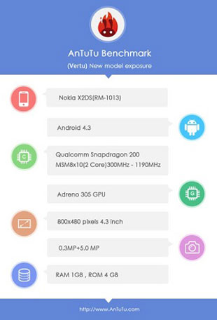 اسمارت فون نوکیا X2 که به تازگی در بنچمارک AnTuTu روییت شده بعضی از مشخصات سخت افزاری از پیش فاش شده خود را تایید کرد. مشخصات این اسمارت فون بنا به بنچمارک و اطلاعات قبلی شامل: پردازنده دو هسته ای با چیپ ست Qualcomm MSM8210، پردازنده گرافیکی Adreno 305، یک گیگابایت RAM، چهار گیگابایت حافظه ذخیره سازی ، صفحه نمایش 4.3 اینچی با رزولوشن 800 در 480، دوربین پشتی 5 مگاپیکسلی و جلویی 0.3 مگاپیکسلی و سیستم عامل اندروید 4.3 می باشد.
