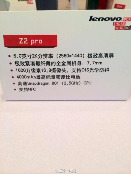 به گزارش منابع چینی شرکت لنوو در حال ساخت گوشی جدیدی با صفحه نمایش QHD و رزولوشن 2560 در 1440 پیکسل است. این منابع نام این گوشی را Vibe Z2 pro ذکر کرده اند. این گوشی یک صفحه نمایش 6 اینچی دارد و ضخامت آن 7.7 میلی متر خواهد بود. همچنین گفته می شود بدنه ی این گوشی از جنس فلز است. این گوشی مجهز به پردازنده ی قدرتمند 4 هسته ای اسنپدراگون 801 با فرکانس 2.5 گیگاهرتز، دوربین پشت 16 مگاپیکسلی با فناوری لرزش گیر اپتیکال،NFC و باتری 4000 میلی آمپر ساعتی است.