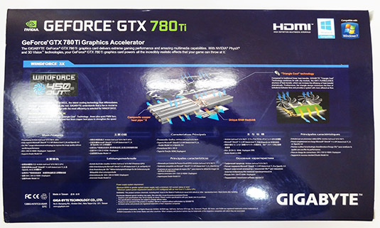 در روی پشت جعبه نیز در مورد ویزگی های کولر این مدل توضیحاتی ارائه شده و به مشخصات فنی این مدل به همراه حداقل پاور توصیه شده برای راه اندازی بدون مشکل این کارت گرافیک اشاره شده است.