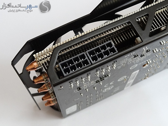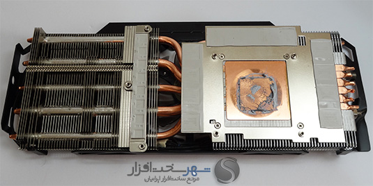 همانطور که ملاحظه می کنید 6 عدد Heat-Pipe در نظر گرفته شده برای این مدل گرما جذب شده از سطح GPU را به دو شبکه مجزا از تیغه های آلومینیومی منتقل می کنند .