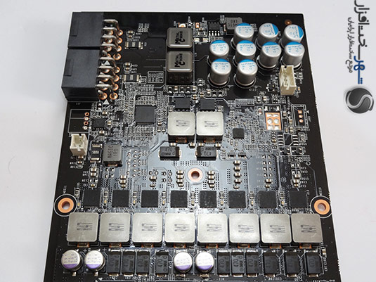در تصویر بالا نمایی بسته از مدار رگولاتور ولتاژ این مدل را ملاحظه می کنید. به کارکیری از خازن های SMD Tantalum که دارای ویژگی های حرارتی و فرکانسی بسیار بهتری نسبت به خازن های معمولی و سالید هستند به همراه استفاده از ماسفت های مدرن DrMOS از جمله مهم ترین کامپوننت های به کار رفته در این مدار محسوب می شود.