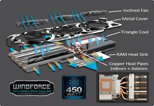 این کولر که برای اولین بار در COMPUTEX 2013 از آن رونمایی شد به گفته کمپانی گیگابایت توانایی خنک کردن قطعات مختلف تعبیه شده بر روی PCB کارت های گرافیک تا TDP 450W را داراست !!