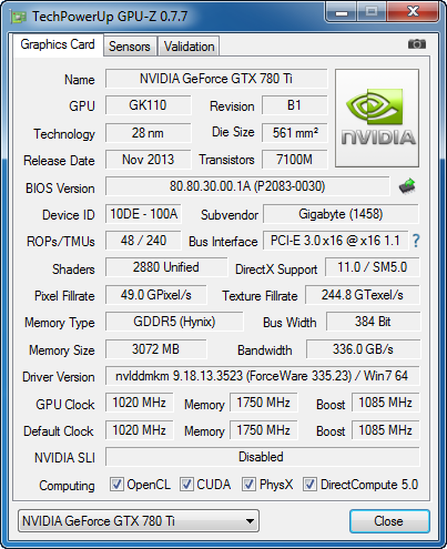در تصویر زیر نیز مشخصات فنی GIGABYTE GTX 780 Ti WINDFORCE 3X 450W 3GB OC را از نگاه نرم افزار GPU-Z ملاحظه می کنید :