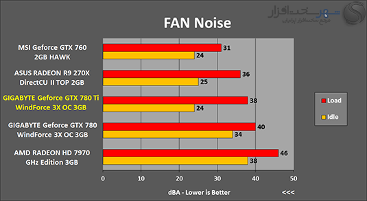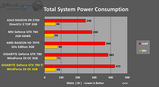 آنجه از قبل هم پیش بینی می شد این موضوع بود که علارغم برابر بودن توان مصرفی Geforce GTX 780 معمولی و مدل ارتقاء یافته آن ( 250 وات ) ولی در عمل Geforce GTX 780 Ti در حالت Full Load حدوداً 10% بیشتر انرژی مصرف می کند. البته از نظر ما این میزان افزایش توان مصرفی در برابر افزایش کارایی محصول، کاملاً بهینه به نظر می رسد.