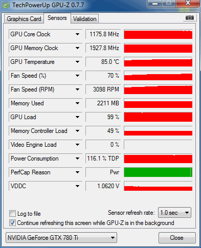 همچنین همانطور که در تصویر بالا ملاحظه می کنید در حین تست های عملی فرکانس هسته GPU تا 1175MHz نیز Boost شده است. همچنین حتی در وضعیت اورکلاک شده نیز حرارت GPU از 85 درجه سانتی گراد نرفته است.