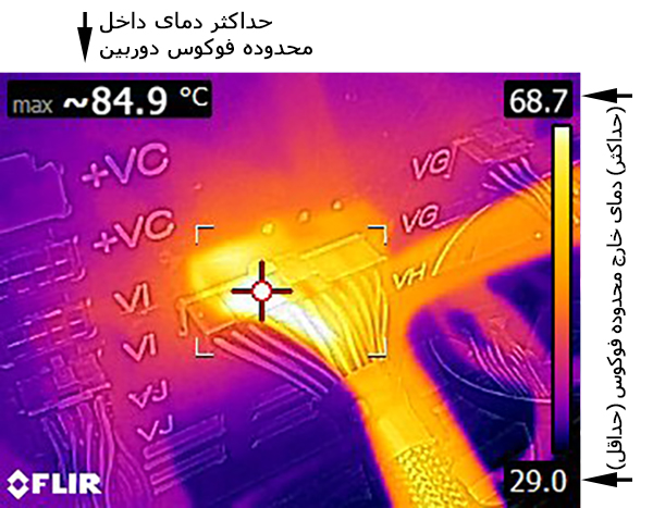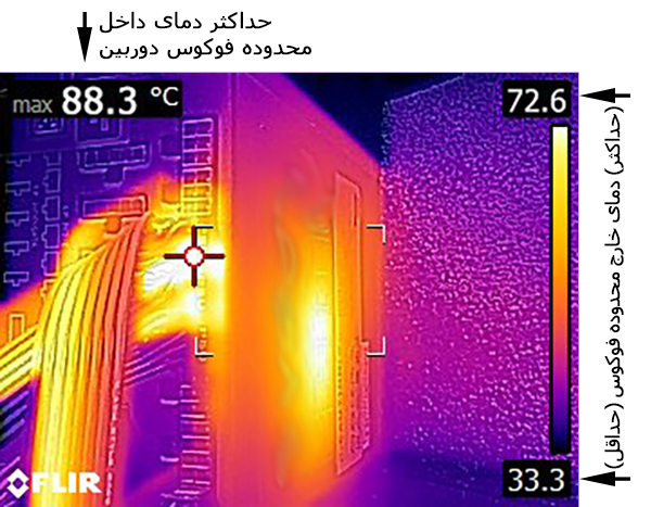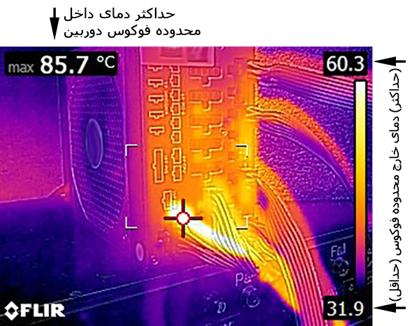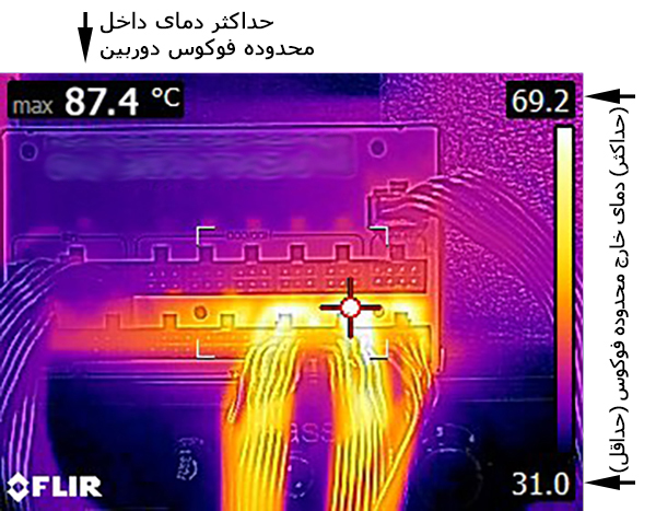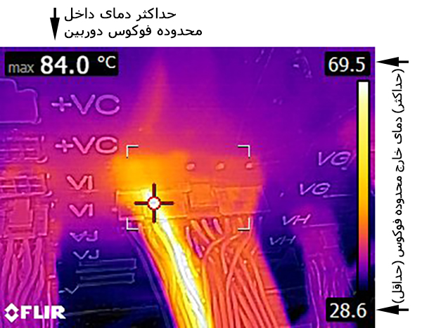در تصاویر بالا شرایط ذکرشده شبیهسازی شده است و حرارت سیمها و کانکتور خروجی 24Pin دو مدل پاور مختلف پس از گذشت تنها 20 دقیقه جریان 18A از شاخه 12V توسط دوربین حرارتی FLIR E5 اندازه گیری شده است. همانطور که ملاحظه میکنید. دمای پین و سیم شاخههای مورد نظر در محل اتصال کانکتور حتی از 85 درجه سانتیگراد نیز تجاوز کرده است و این امر در طولانی بدون شک باعث بالاتر رفتن این دما و در نهایت سوختن کانکتور خواهد شد.