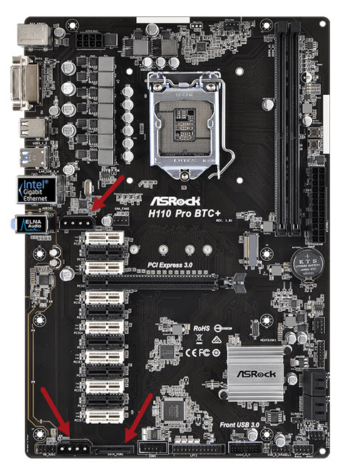 همانطور که در تصویر بالا ملاحظه میکنید در مادربردهای مخصوص ماینینگ با تعبیه کانکتورهای برق متعدد از نوع Molex و SATA بر روی PCB مادربرد، شریانهای شاخه +12V تقویت و از عبور جریان بیش از حد از پینهای شاخه +12V تعبیه شده بر روی کانکتور ATX-24Pin جلوگیری میشود. همچنین جدیداً برخی سازندگان مادربرد در جدیدترین محصولات خود از کانکتورهای تقویت شده برق بر روی مادربرد استفاده میکنند تا مشکلات ناشی از سوختگیهای سوکت را به حداقل برسانند.