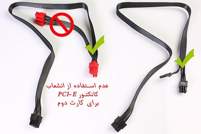 - تا حد امکان از اتصال کابلهای PCIe دارای دو خروجی PCIe-8Pin به دو کارت گرافیک مجزا (هر یک دارای تنها یک کانکتور هشت پین) خودداری کنید. توصیه میشود در صورتی که منبع تغذیه شما به این نوع کابلها مجهز شده است، تنها یکی از خروجیها را به کارت گرافیک مورد نظر متصل کنید.