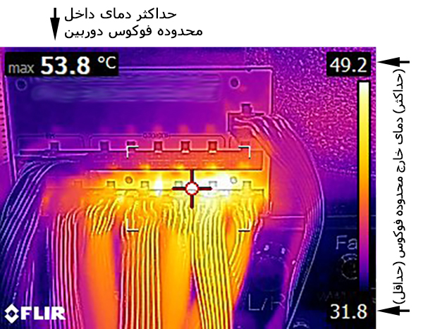 در تست دوم بهجای استفاده از 3 کابل مجهز به دو خروجی PCIe-8Pin از 6 کابل مجزا دارای تنها یک خروجی PCIe-8Pin استفاده کردیم. همانطور که در تصویر دوربین حرارتی مشخص است به دلیل کاهش شدت جریان بر روی هر کابل و تقسیم شدن این پارامتر بر روی 6 کابل، دمای محل اتصال کانکتورهای ماژولار پاور به مقدار بسیار قابل توجهی کاهش یافته است.