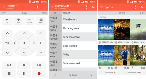 این اسمارت فون HTC از IR blaster توکار برخوردار است که آن را قادر به کنترل تلویزیون شما می کند. و بوسیله اپلیکیشن HTC Sense TV، به احتمال شما قادر خواهید بود مستقیماً از برنامه در حال پخش آگاه شوید و با کلیک بر روی دکمه آن به شبکه مورد نظر هدایت شوید( تصویر مربوط به نسخه اندرویدی اپلیکیشن Sense TV است).