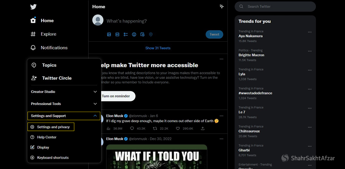 برای فعال سازی رمز دو مرحلهای در توییتر ابتدا باید به بخش تنظیمات این اپلیکیشن پیام رسان بروید. پس از آن گزینه More را انتخاب کرده و از بخش Settings and Support گزینه Settings and privacy را برگزینید.