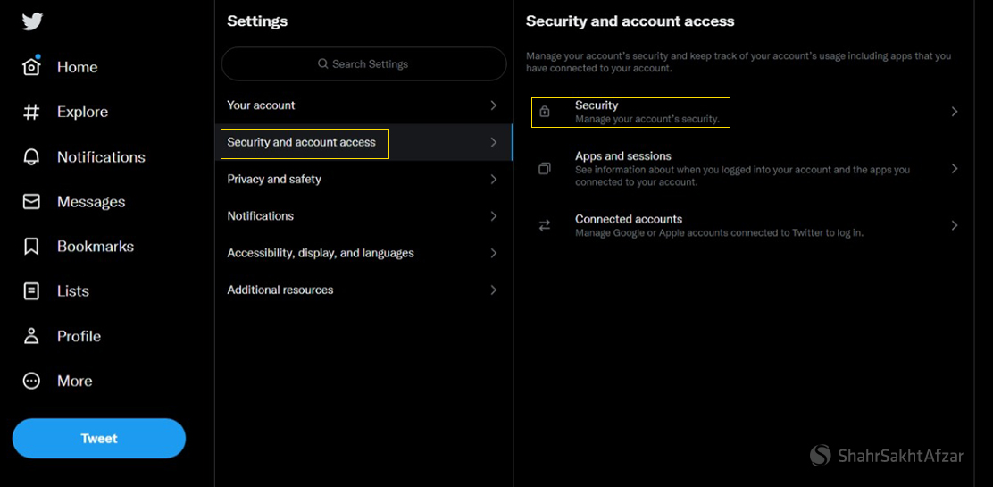 برای فعالسازی رمز دو مرحله ای در توئیتر و در پنجره جدید Security and account access را انتخاب کرده و در منوی باز شده گزینه Security تا به ابزارهای افزایش امنیت توییتر دسترسی پیدا کنید.