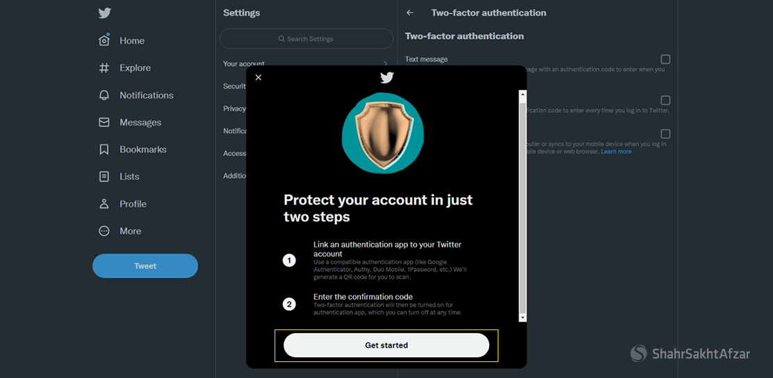 پس از انتخاب Authentication App برای ادامه مراحل فعال کردن تایید دو مرحله ای توییتر به صفحه جدیدی هدایت خواهید شد و سپس باید گزینه Get Started را برگزینید تا به بخش بعدی فرآیند فعال سازی تأیید Twitter 2FA با استفاده از Google Authenticator بروید.
