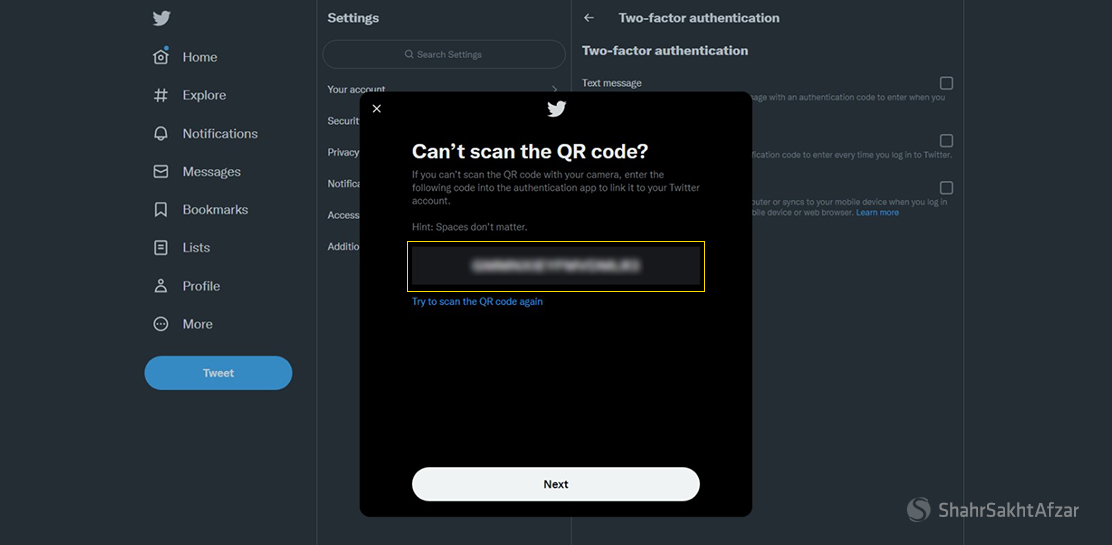 در این بخش از آموزش فعال کردن تایید هویت دو مرحله ای در توییتر باید گفت که اگر امکان استفاده از دوربین گوشی فراهم نیست میتوان با انتخاب گزینه Can't Scan the QR Code از کدهایی که توییتر در اختیار شما قرار میدهد به جای QR Code برای فعال سازی رمز دو مرحله ای در توییتر استفاده کنید.