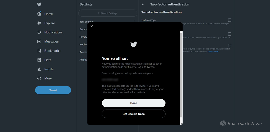 اگر همه مراحل را به درستی انجام دهید با پنجره زیر مواجه خواهید شد و این یعنی کار تمام است و شما با موفقیت فعال سازی رمز دو مرحله ای در توییتر را به اتمام رسانده و فرآیند افزایش امنیت توییتر را با موفقیت طی کردهاید.
