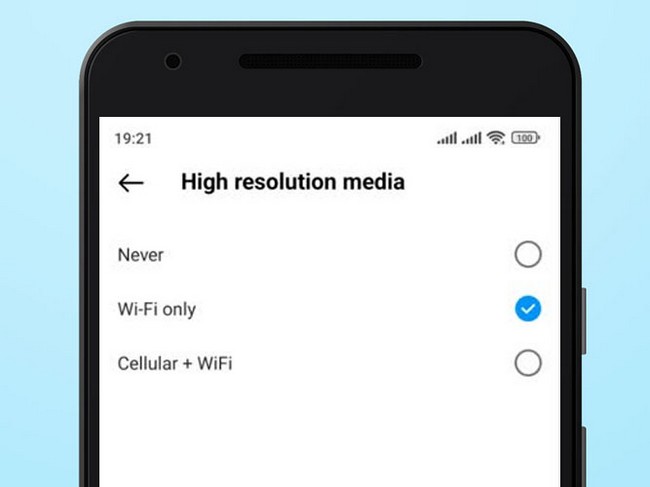 اگر از گوشیهای اندرویدی استفاده میکنید، با فعالسازی Data Saver امکان انتخاب شبکه مورد نظر برای نمایش محتوای باکیفیت و با حجم زیاد نیز وجود دارد. بهاین منظور، پس از فعالسازی Data saver، روی High Resolution Media کلیک کرده و یکی از گزینههای زیر را انتخاب کنید: