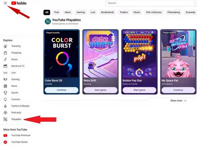 بازی های مرورگری یوتیوب ازطریق وبسایت یوتیوب یا اپلیکیشن این پلتفرم در دسترساند. برای دسترسی به این بازیها وارد حساب کاربری خود شده و از منوی کناری، روی Playables کلیک کنید تا فهرست بازیها بهنمایش درآید. توجه داشته باشید که این قابلیت بهمرور برای کاربران در سراسر دنیا در حال بازشدن است.