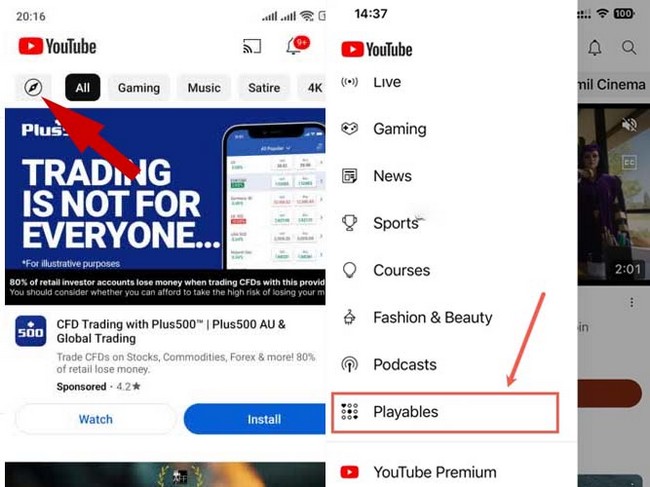 برای گیم زدن در یوتیوب باید وارد سایت یا اپلیکیشن یوتیوب شوید. سپس وارد حساب کاربری خود شده و از منوی Explore وارد قسمت Playables شوید.