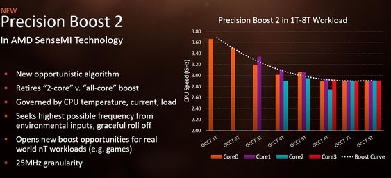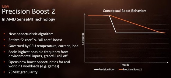 AMD خود جزئیاتی از یکی از آن قابلیتها و تغییرات جدید ارائه کرده است. این کمپانی اعلام کرده با پردازندههای مبتنی بر ریزمعماری +Zen فناوری Precision Boost 2 را ارائه میکند. کارکرد Precision Boost مشابه فناوری توربو بوست در پردازندههای اینتل است. می دانیم نسل فعلی Precision Boost فقط از بوست دو هسته و تمامی هسته پشتیبانی میکند.