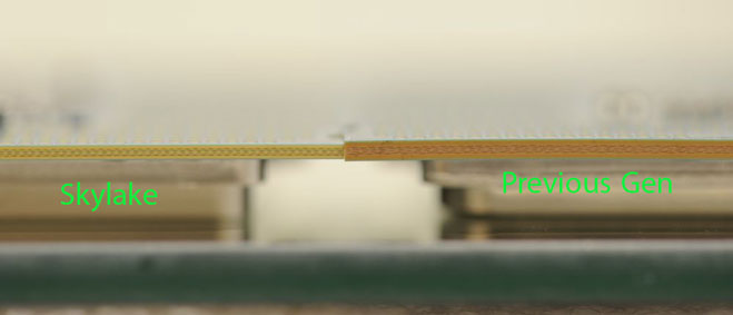 با اینکه به نظر میرسد احتمال آسیب به پردازنده در طول حمل و نقل (در صورت نصب بودن خنک کننده) و یا نصب مجدد خنک کننده محتملتر است، احتمال آسیب دیدن پردازنده در استفاده معمول نیز وجود دارد. همانطور که در تصویر پایین مشاهده میکنید، پردازندههای Skylake نسبت به نسلهای پشین از جمله Broadwell و Haswell، ارتفاع یا به عبارتی دیگر، ضخامت کمتری دارند، از این رو در پارهای از موارد و با برخی خنک کننده ها، احتمال لق زدن وجود دارد.