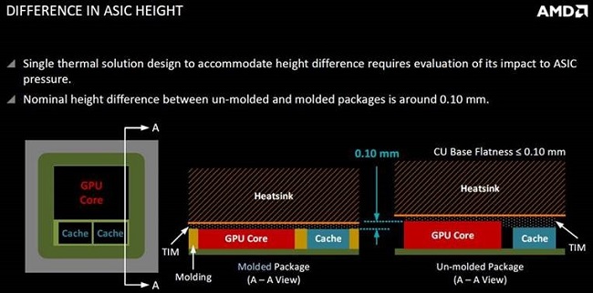 تصاویر موجود نشان می دهد پکیج کارت های AMD Vega و حتی تراشه های HBM2 توسط سازندگان مختلف تولید می شود که در برخی از آنها ارتفاع تراشه های HBM2 با پردازنده گرافیکی برابر نیست. اینجاست که برای تماس مناسب با سطح کولر باید این خلاء توسط یک ماده رسانای حرارت مناسب (مثل خمیر) پرُ شود. اما از آنجایی که پکیج های AMD Vega از سوی سازندگان متعدد تامین می شوند، سازندگان کارت گرافیک نمی توانند از یک کولر و خمیر یکسان برای همه کارت ها استفاده کنند.