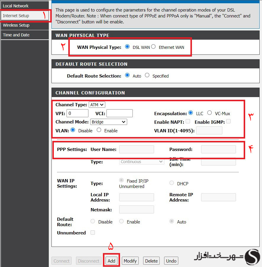 حالا مقادیر VPI و VCI را وارد کرده و Channel Mode را بر روی گزینه PPPoE قرار دهید. روبروی گزینه PPP Setting نام کاربری و رمز عبور دریافت شده از شرکت ارائهدهنده اینترنت را تایپ کنید.