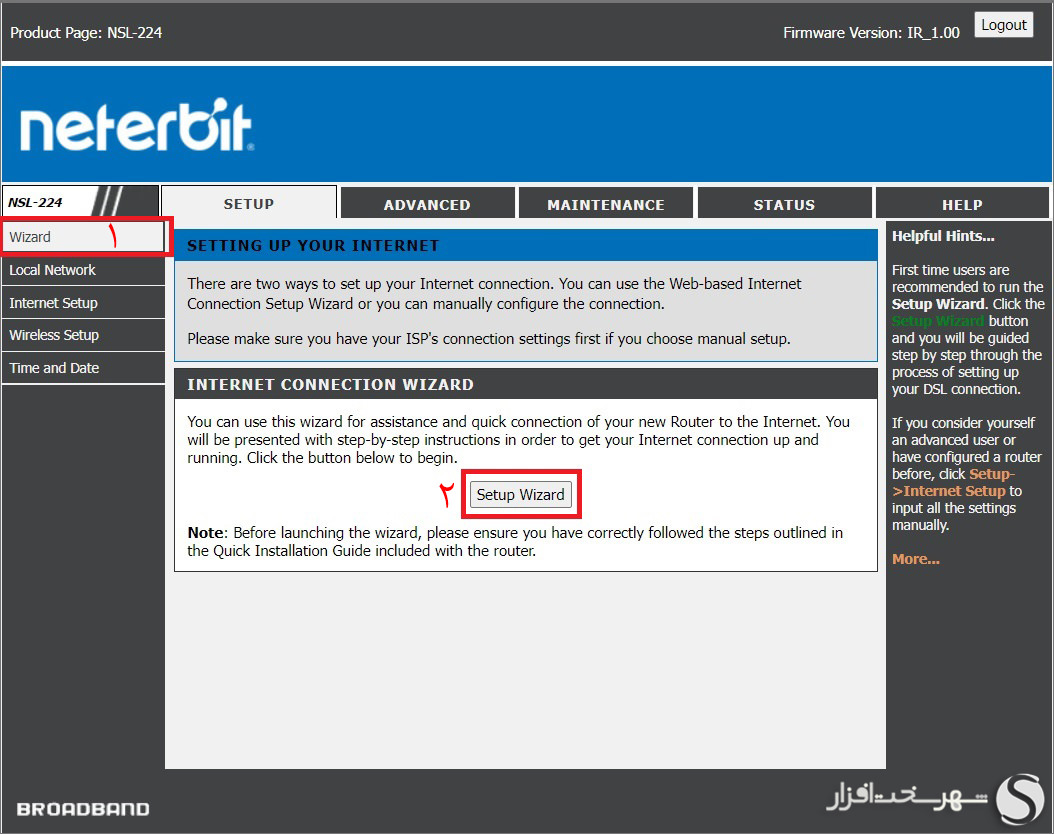 در وهله اول به سراغ آموزش کانفیگ مودم نتربیت به روش سادهتر رفتهایم، بنابراین در منوی سمت چپ گزینه Wizard را انتخاب و سپس بر روی دکمه Setup Wizard کلیک کنید.