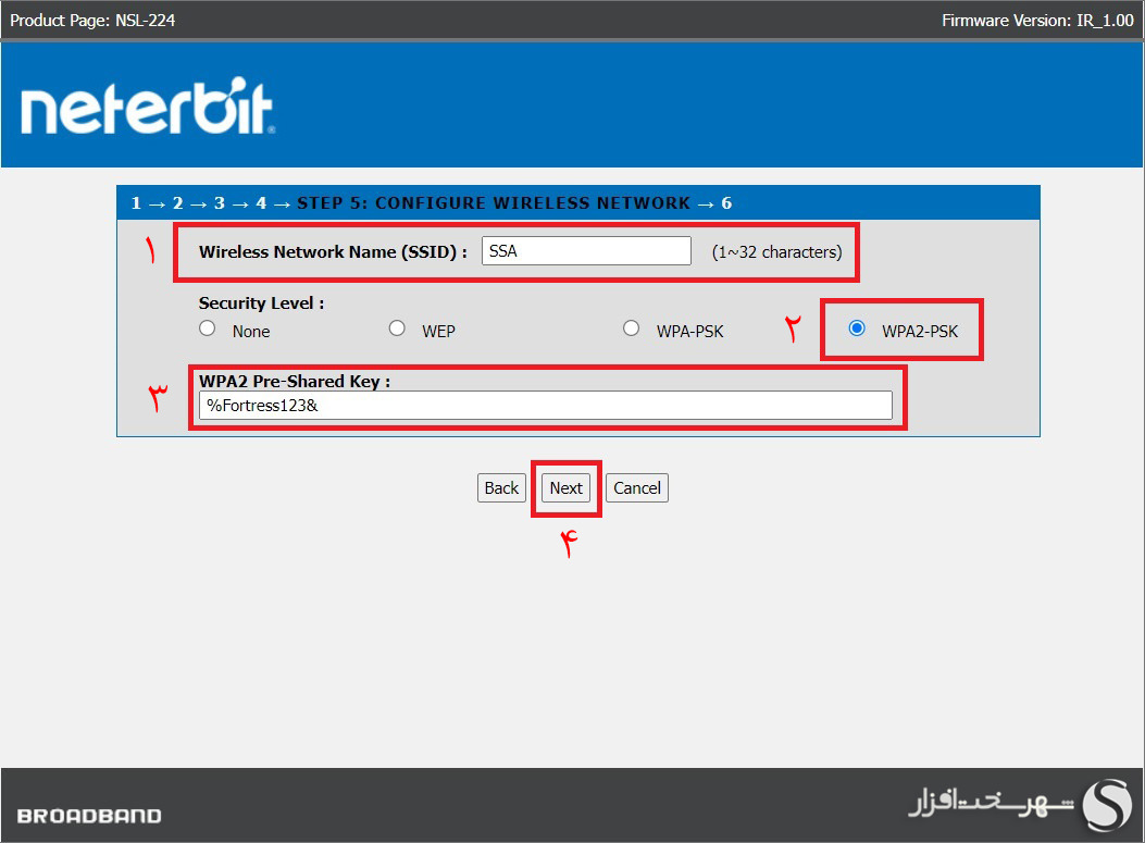 در بخش پنجم تنظیمات مودم از شما خواسته شده برای شبکه وایرلس خود یک اسم (SSID) انتخاب کنید. علاوه بر این، در قسمت Security Level باید پروتکل امنیتی خود را انتخاب کنید، البته به صورت پیش فرض گزینه WPA2-PSK انتخاب شده که در این فریمور پیشرفتهترین گزینه امنیتی مودم روتر نتربیت مدلNSL-224 محسوب میشود.
