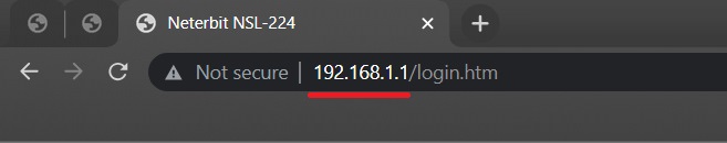 برای ورود به تنظیمات مودم Neterbit به یک نرمافزار مرورگر اینترنت نیاز دارید. مرورگر مورد نظر خود را باز کرده و در بخش آدرس اینترنتی، IP مودم را وارد کنید. این IP بر روی برچسب زیر مودم درج شده و معمولاً 192.168.1.1 است.