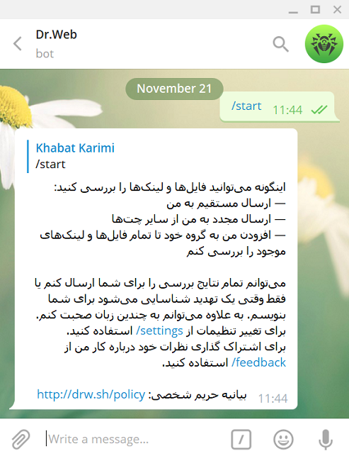 این ربات توسط کمپانی امنیتی مشهور و معتبر Dr.Web توسعه یافته است، بنابراین با خیال آسوده میتوانید از آن استفاده کنید. جالبتر اینکه بات تلگرامی @DrWebBot از زبان پارسی نیز پشتیبانی میکند. استفاده از این بات تنها به کامپیوتر محدود نمیشود و بر روی تمامی دستگاههایی که از تلگرام پشتیبانی میکنند قابل استفاده است.