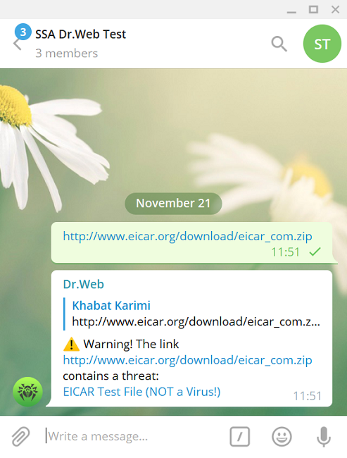 هنگامی که بات DrWebBot را به گروهها اضافه میکنید، با ارسال هر فایل یا لینک در گروه، به صورت خودکار اسکن میشود و نتیجه به تمامی اعضای همان گروه نمایش داده میشود. بنابراین همه اعضای گروه نسبت به آلودگی احتمالی مطلع میشوند.