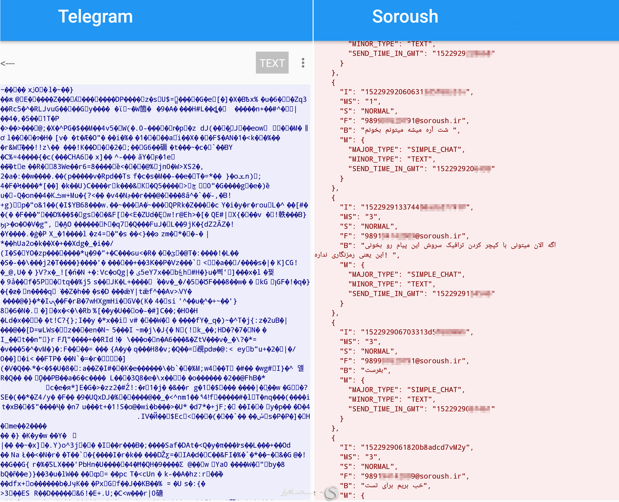 حتی اگر حمله کنندهای هم در کار نباشد، سایر برنامههای نصب شده بر روی دستگاه کاربر قادر به استراق سمع کلیه فعالیتهای سروش هستند. برای درک بهتر این موضوع، تلگرام کلیه پیامها را رمزنگاری می کند و اگر ترافیک آن شنود هم شود، هیچ چیز قابل خواندن نیست.