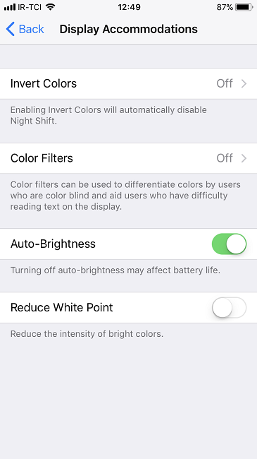 اگر شما هم به iOS 11 مهاجرت کردهاید، برای غیر فعال سازی قابلیت Auto Brightness باید به یک منوی دیگر مراجعه کنید، حالا این قابلیت در مسیر "General/Accessibility/Display Accommodations" قرار دارد. بنابراین باید ابتدا به منوی تنظیمات اصلی رفته، پس از پشت سر گذاشتن General، پس از آن Accessibility و در نهایت Display Accommodations؛ گزینه Auto Brightness را مقابل خود خواهید یافت.
