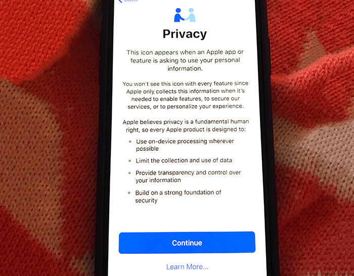 - صفحهی حریم خصوصی: در حین فرآیند راهاندازی پس از نصب iOS 11.3 یک صفحهی حریم خصوصی و آیکون آن نمایش داده میشود که به شما میگوید از این پس زمانی که یک قابلیت یا برنامهی اپل درخواست اطلاعات شخصی شما را داشته باشد این آیکون نمایش داده خواهد شد.