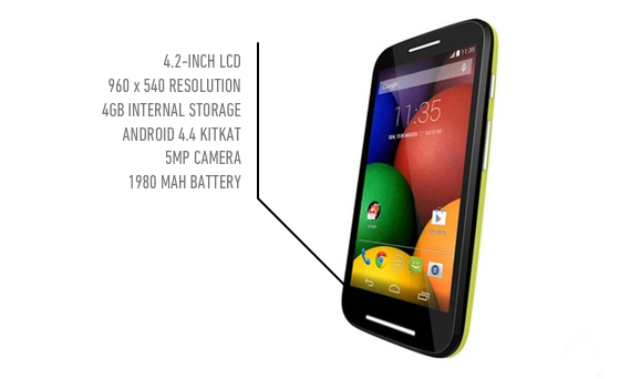 تنها پس از شش ماه، Moto G تبدیل به پرفروش ترین گوشی شرکت موتورولا شد که هنوز هم در کشورهای برزیل و مکزیک اولین انتخاب مشتریان اسمارت فون محسوب میشود. با چنین آمار موفقیت آمیزی، تعجبی نداشت که موتورولا در جهت تکرار فرمول قبلی مجدداً برنامه ریزی کند و این بار حتی بلند پروازی بیشتری از دفعه قبل داشته باشد: ارائه گوشی پیشرفته تر از Moto G و در عین حال قیمت پایینتر! Moto E تنها 129 دلار قیمت دارد و دارای صفحه نمایش 4.2 اینچی است که کمی کوچکتر از صفحه نمایش 4.4 اینچی Moto G بوده و ضمناً به فلاش LED نیز مجهز نیست اما دوربین 5 مگاپیکسلی و آخرین نسخه اندروید 4.4 را بر روی خود دارد. بهتر از همه اینکه موتورولا قول داده است در آینده نسخه بروز سیستم عامل اندروید را بر روی این گوشی قرار دهد همانطور که برای Moto G هم سال گذشته به همین منوال عمل کرد.