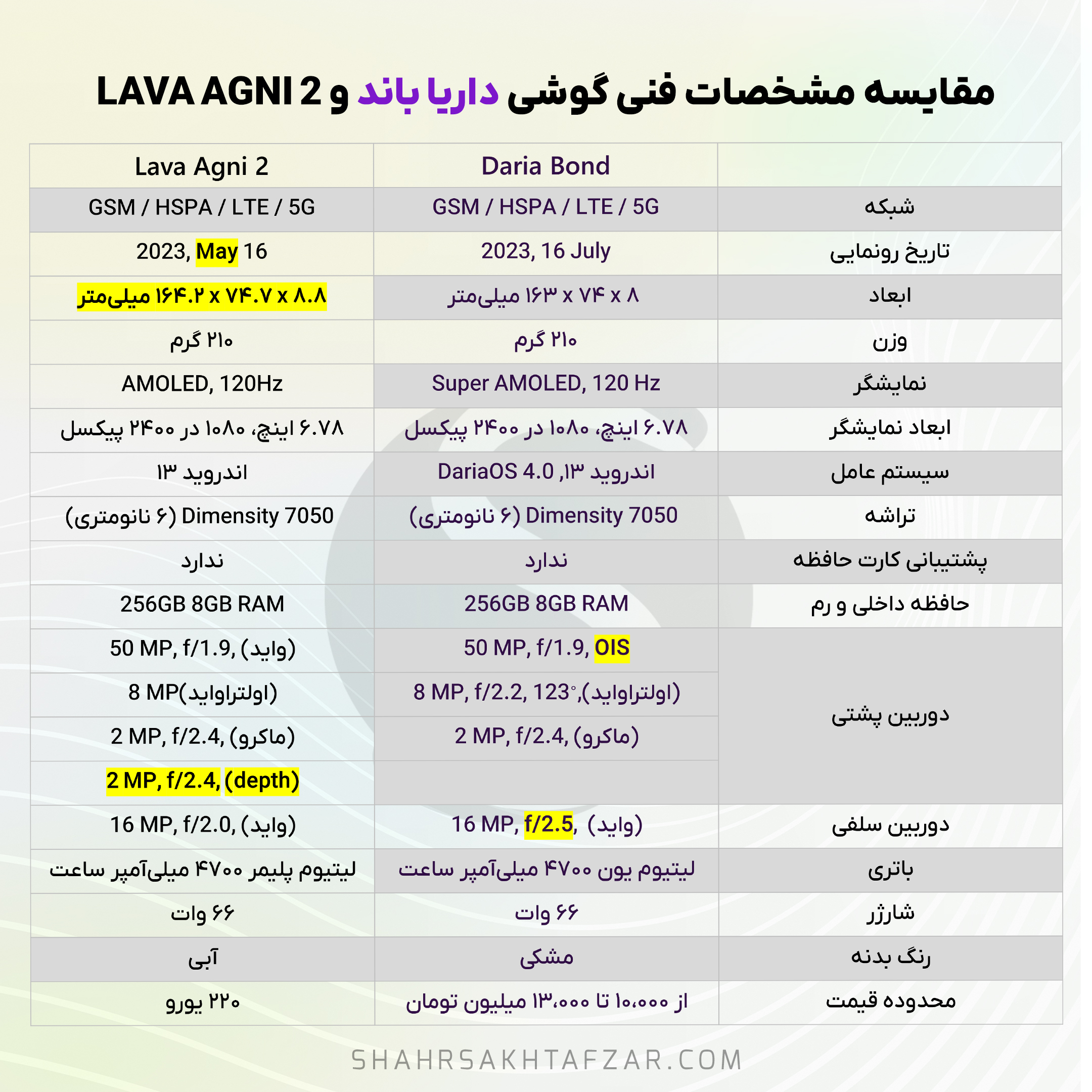 مقایسه گوشی DARIA BOND با Lava Agni 2 و تشابه های آنها