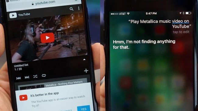 دلیل: گوگل اسیستنت با طرح درخواست برای پخش موزیک ویدئویی از گروه متالیکا، سریعا صفحه مربوطه را در یوتیوب باز کرد اما فرایند پخش را آغاز نکرد. در صورتی که ما در منزل حضور داشتیم حتی این امکان وجود داشت تا از گوگل اسیستنت برای پخش ویدئو روی تلویزیونی مجهز به کروم کست هم استفاده کنیم. در طرف دیگر میدان، سیری نتوانست این درخواست ما را برآورده کند.