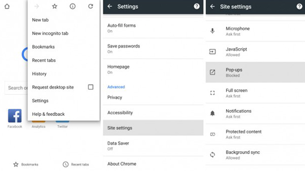 اگر تنها تبلیغات پاپآپ، شما را به دردسر انداخته است و تمایلی به نصب برنامه شخصثالث ندارید، تنها کافی است از تنظیمات مروگر گوگل کروم برای متوقف نمودن نمایش این تبلیغات آزاردهنده اقدام نمایید. بدین منظور، مرورگر گوگل کروم را در گوشیهوشمند یا تبلت اندرویدی خود اجرا کنید؛ سپس بر روی آیکون «سه نقطه» در گوشه و بالای مرورگر، ضربه بزنید. از منوی باز شده، وارد بخش Settings شده و سپس، Site Settings را انتخاب نمایید.