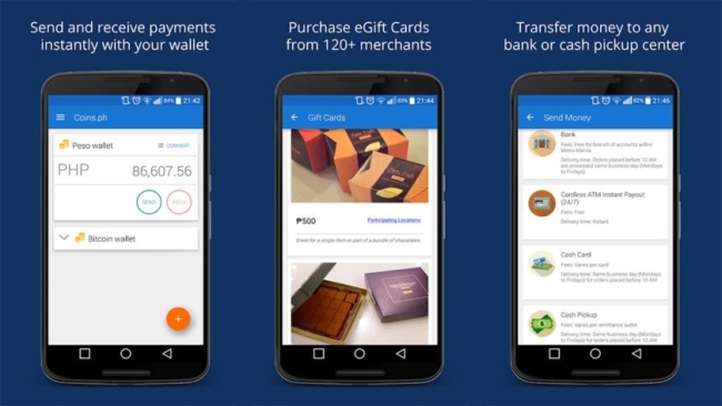 نرمافزار Coins.ph Wallet هم از جمله کیف پولهای دیجیتالی است که قابلیتهای جذابی برای کاربران دارد. این اپلیکیشن امکان مشاهده موجودی، انتقال وجه، خرید و گزینههای دیگر را پیش روی شما قرار میدهد. طراحی متریال در منوهای این نرمافزار، به خوبی خودنمایی میکند اما نکته قابل توجه، گزینههای خریدی است که در رابط کاربری برنامه ادغام شده است. با استفاده از این کیف پول دیجیتالی، امکان خرید گیفت کارت را از چیزی بیش از ۱۲۰ برند مختلف خواهید داشت. علاوه بر این، امکان پیدا کردن بانکها و فروشگاههای مختلف نیز از منوی برنامه وجود دارد.
