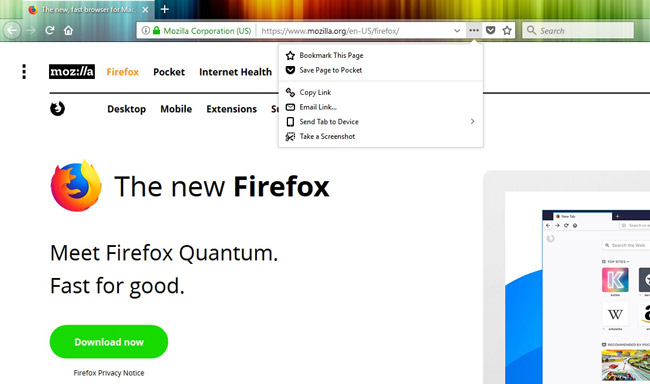 همچنین یک گزینه جدید به شکل سه نقطه در انتهای نوار آدرس قرار گرفته که در آن گزینههای Bookmark، ارسال URL به سایر دستگاههای همگام شده با فایرفاکس و گرفتن Screenshot قرار گرفته است.