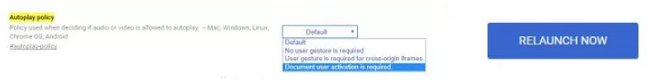 در بالای صفحه ظاهر شده، بخشی با عنوان Autoplay policy وجود دارد که به صورت خودکار بر روی گزینه Default قرار گرفته است. اگر قصد دارید از اجرای خودکار ویدیوها جلوگیری کنید باید این گزینه را بر روی Document user activation is required قرار دهید. به این ترتیب کروم پیش از اجرای هر ویدیویی به تایید کاربران نیاز خواهد داشت. در انتها باید برای ذخیره تنظیمات، در پایین صفحه بر روی دکمه Relaunch Now کلیک کنید.