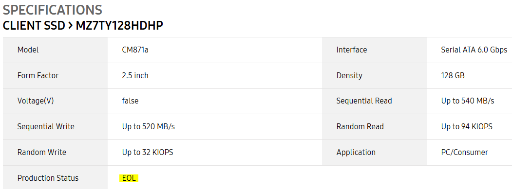 مشخصات رسمی موجود در وب سایت سامسونگ نشان میدهد این SSD با شناسه CM871a از نوع TLC است، در حالی که SAMSUNG 850 PRO از نوع سریعتر و بادوامتر MLC است.