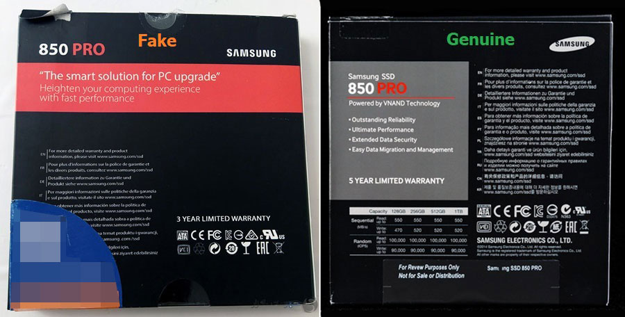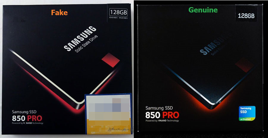 همچنین عبارت "SAMSUNG 850 PRO" در لبه بالایی جعبه نمونه تقلبی، در قالب دو سطر نوشته شده، در حالی که در نمونه اصلی تنها یک سطر است.