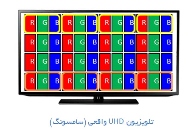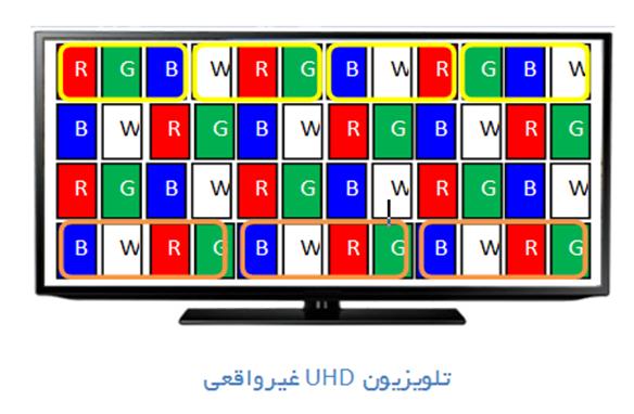 نکته مهم آنکه بسیاری از تولیدکنندگان، تلویزیونهای UHD غیرواقعی را روانه بازار میکنند؛ یعنی جهت کاهش قیمت تمامشده تلویزیون، بخش زیادی از تصاویر، با پیکسل سفید (W) ساخته میشود که هیچ کیفیتی ندارد. در نتیجه، در این تلویزیونها تصاویر دیگر هشت میلیون پیکسل نخواهد بود و کیفیت تصویر به میزان نیمی از این کیفیت تقلیل خواهد یافت.